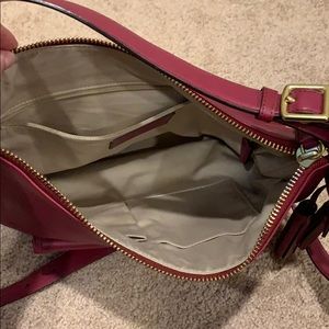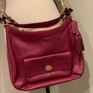 Coach cranberry leather crossbody bag. Purse only used a few times. Gold hardware, outside latch pocket, interior has 1 zipper pocket and two open pockets. Purse can be worn as a shoulder bag as well. Measurements: length 13 in, depth 4 in, height 11 in.