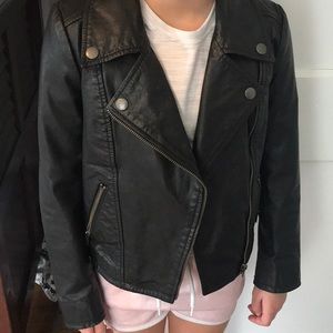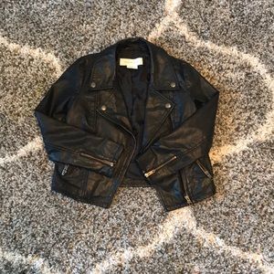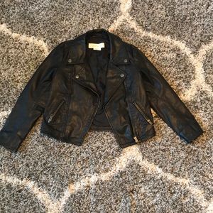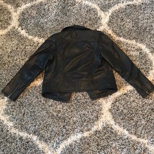 Treasure & Bond Girl’s Leather Moro Jacket Size S. Sizing is generous- model is a size 8 and it fits great, but believe the small is more akin to a 6/8. If your daughter has an attitude, get her a cool jacket to match 😎😎