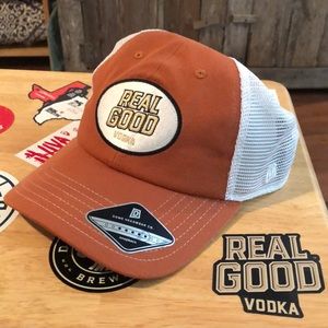 Second Hat: Real Good Vodka Trucker Hat. Dark Blood Orange and White. Never worn before.