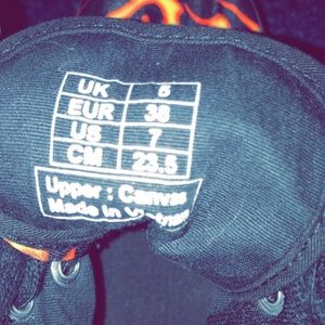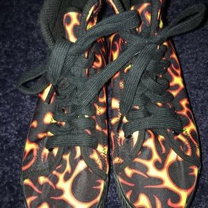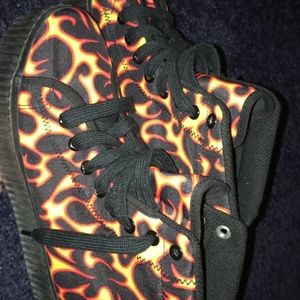 Authentic Jeffery Campbell platform sneakers with a flame pattern all over. Size 7, but runs a little small. Won’t fit well on a wide 7, 6.5 would fit comfortably. Please press the make me an offer button instead of asking about the price in the comments.