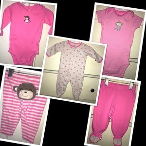 Carters brand 5pc. Outfit set/bundle for a baby girl- size: 3m - in excellent used condition. Bundle includes two sets of 2pc. Matching outfits (onesie & pants), and one snap footie sleeper
