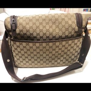 GG Supreme canvas diaper bag, designed with multiple pockets and fold-out changing mat.