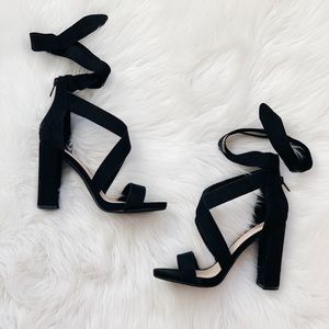 These gorgeous block heel sandals feature a sexy but sophisticated heel and ribbon tie! We are obsessed with the open toe look, and they zip in back! Cute and functional!