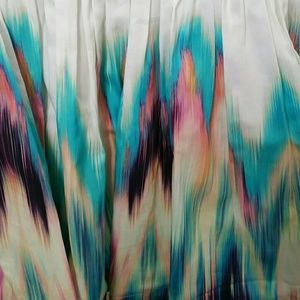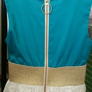 Brand new with tags Zoe Ltd. tween girls’ party dress with teal blue/green bodice and ivory and multi-colored ikat skirt bottom. Gold elastic waistband accented with sparkling faceted jewels leads to pintuck detailed skirt. Skirt has a layer of crinoline for volume. Gold zipper closure in back. Fully lined. Material is a smooth sateen. Bodice is 97% cotton, 3% spandex; skirt is 100% cotton. Made in USA.