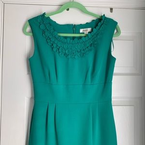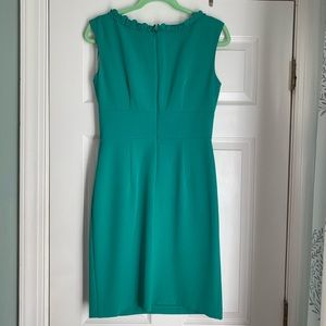 Pictures do not do this dress color justice. Beautiful emerald green dress with detail around the neck line. Great condition!