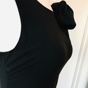 Black fit and flare dress with dramatic side-tie bow. Ruching on one side. Concealed back zipper.