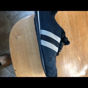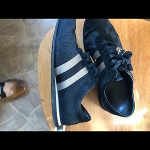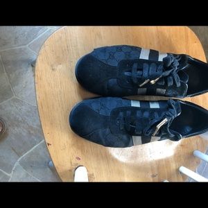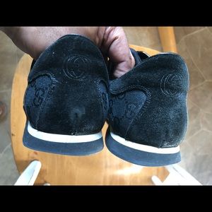Authentic Monogram Blk Gucci suede trainers. Please check the pics. The right shoe has a hairline tear. These are unisex. Gucci size 8 which translates into US Women’s 10 Men’s 9.