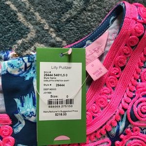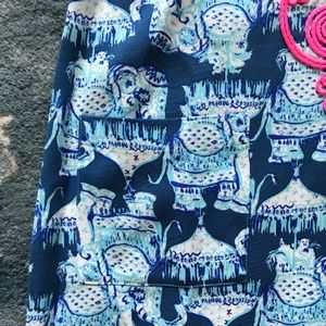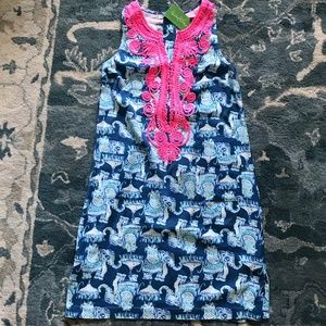 Stunning Lilly Pulitzer Carlotta Stretch Shift Dress in Deep Indigo, Joy Ride. It is a size zero and retails for $218. It has a gorgeous neckline detail with a gold clasp details. The dress has an elephant pattern with two pockets in the front. It is style number 29444. Make an offer!