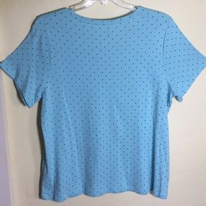 NEW WOT. Turquoise with black dots, lightweight for spring & summer, shortsleeved, v-neck. Pit to pit - 24”. Length from shoulder - 28 1/2”