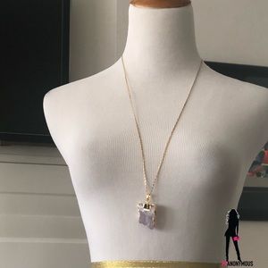 From Function & Fringe. Gold plated amethyst druzy agate pendant. Finished with Function & Fringe signature gold-plated feather charm at the clasp. 18 kt gold plated 30" chain. Designed and made in California. No two are alike. Each is a unique piece.