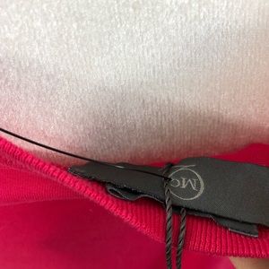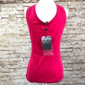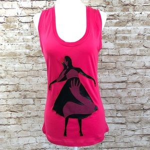 Pink and black McQ Alexander McQueen sleeveless top with scoop neck and graphic print at front.