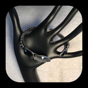 This bangle bracelet, is best described where leather meets lace. Chain covers the middle of the bangle on each end is 2 large faceted rhinestones. The rectangular rhinestone is black the other is gray. This bracelet has a small opening that allows it to bend a bit to slide on with ease. In great condition.