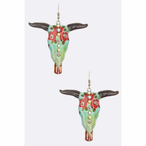 Boho Rose Print Longhorn Skull Dangle Earrings