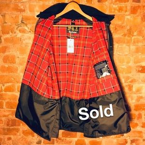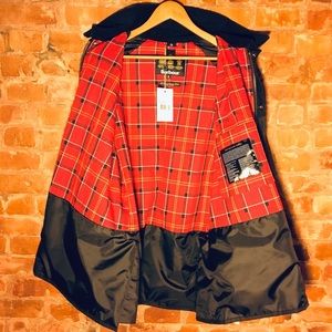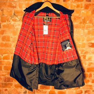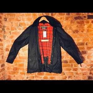 XL Barbour Black waxed Jacket with red plaid lining! New with tags on! Plaid fabric lines the cuffs and corduroy collar of a utilitarian, waxed-cotton jacket framed with long raglan sleeves.