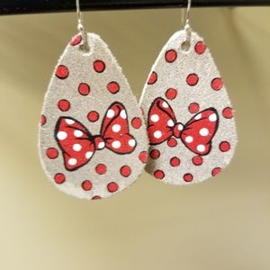 Who doesn't want to rock the dots? These are painted on shimmery faux leather pieces, and the bow has extra glitter for some sparkle!! A super fun pair of earrings to add to your collection! These are super fun to wear and make a great statement!