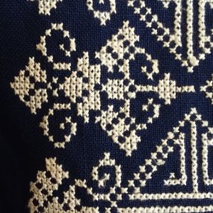 This dress is a one of a kind absolutely classic timeless style. It is HAND SEWN, very well constructed and EVERY white cross stitch is done by hand. Gorgeous deep pleats at the natural waist. Fully lined unhemmed cotton lining. This dress came from Grandmother's closet and I do not know the history. I know that I wore it to my wedding reception as my "going away" dress. At the time I was a size 8. Waist 14", Bust 17", length 35" . Fabrication unknown, but quality drape! Royal Navy and white.