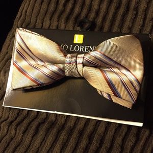 Tan bow tie with brown, blue and white stripes crossing diagonally (tie is textured)
