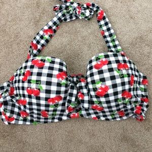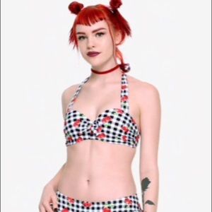 New with tags Hot Topic Women’s Black And White checker gingham cherry Swim Top. Be a total cherry bomb on the beach this summer. This halter swim top has an allover black and white gingham print mixed with cherries for a vintage-inspired look worthy of any pinup. The lightly padded, molded underwire cups give great support and have adorable ruffle details at the bust line and a center bow detail.