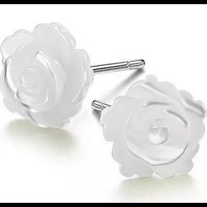 New! Beautiful sterling silver white rose stud earrings. They are made of plastic, and are secured by push back closures.