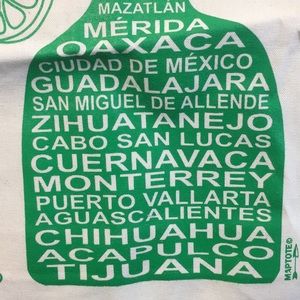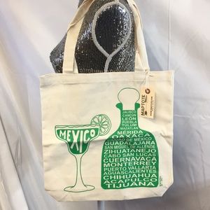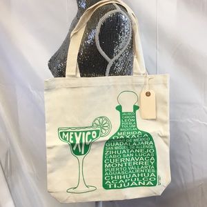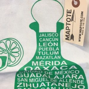 Maptote Mexico tote bag retired hats to find with lots of cities listed on bottle image and has margarita image with lime.