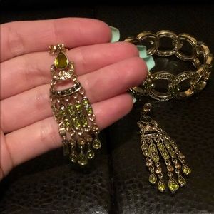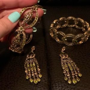 Gold tone with green stones. Two stretchy bracelets and matching earrings. Worn but in excellent condition.