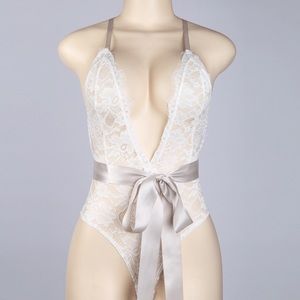White Eyelash Lace Plunging V-neck Sexy Teddy Bodysuit with Silky Silver Belt