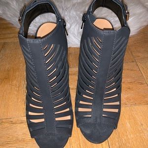 Black heel, really cute for spring weather! Little defect in heel (shown in picture) but could barely tell. Otherwise in great condition!