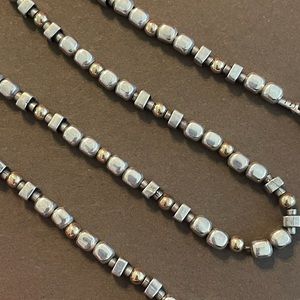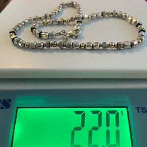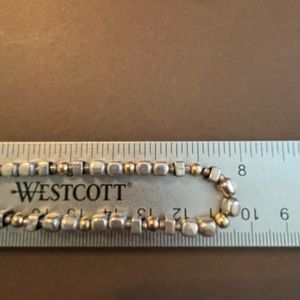 Catalog description “The beauty in versatility of this Sterling Silver Necklace is complemented by the simplicity of small Gold Filled Beads. 16” long with the lobster clasp.”