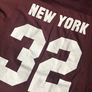 Top half is mesh and bottom is cotton. It is a maroon tee with writing on the BACK of the shirt.