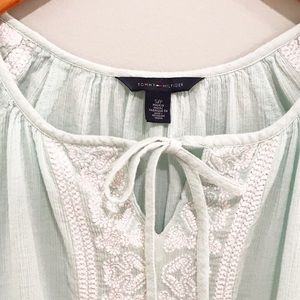 This beautiful Tommy Hilfiger top is a light cyan color with shirring ruffled bands around the bottom and sleeves. It has white embroidered designs on the front and shoulders. Very light weight fabric that’s great for summer. Kept in a smoker free home. Size small petite