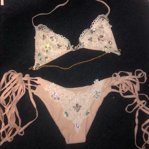 Sexy low cut, rine stone, lacy baithing suit.