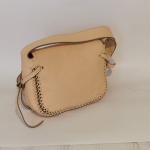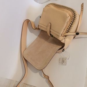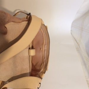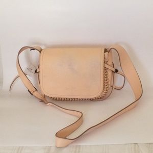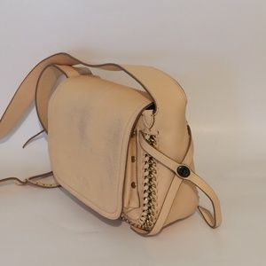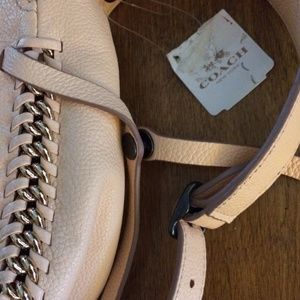 New Authentic Coach Apricot/Peach/Pink Crossbody Purse. Nice long durable shoulder strap, adjustable for comfortable fit. Darkened area on face of flap from rubbing against black purse in storage. Embossed horse and buggy COACH logo on front flap.