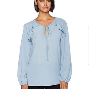 Beautiful long sleeve crew neck blouse with front keyhole opening, tie closure and front ruffle detail from BCBG Maxazria. Perfect for spring. Would look great dressed up or down with jeans or a skirt. Size: Large