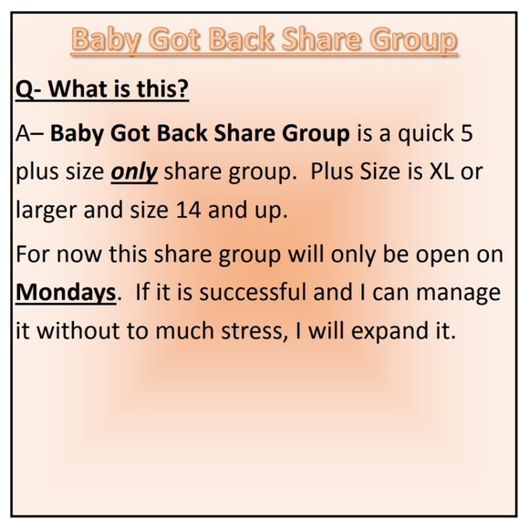 @kellyfrasher @lucygold17 @vickies74 @nokia97 Thank you for participating in Baby Got Back Share Group or expressed some interest in the group. I hope can join the group this week. Please sign-up for Monday, May 13th. If you haven't already, please tag your closet in the comment box under Monday’s listing. Sharing starts at 6am EST and closes at 2pm EST. Please share 5 plus-size item.