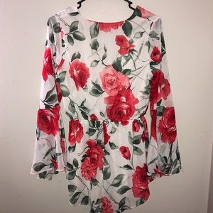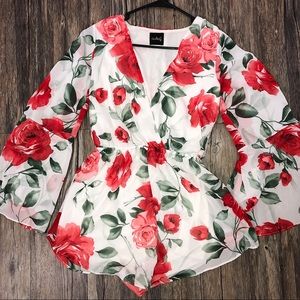 Gorgeous romper covered in rose print with beautiful bell sleeves. Elastic at waist and is very stretchy . Perfect summer outfit ! This is a NEW BOUTIQUE item that did not come with tags! **Never been worn but does not have any tags. Willing to negotiate! 💕