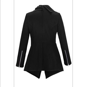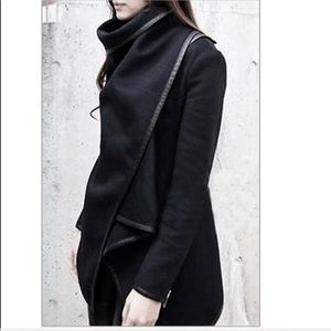 Black asymmetrical hem wrap coat. Black felt coat is trimmed in black pleather. Can be worn open with lapels creating a waterfall drape effect or with the right lapel folded at the top and wrapped around the neck fastened by button at the back neck, creating asymmetrical hem as shown. This coat runs a size small according to the wholesale website, so I am listing them as such. Will best fit a size 2-6. Eye catching versatile statement coat! Smoke free home.