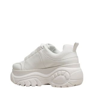 Sneakers feature a lace-up front, a padded opening, stitched accenting, and a carved, sporty, super thick platform complete with a patterned sole.