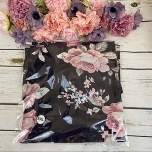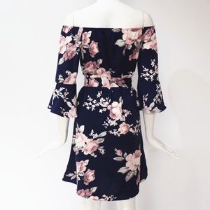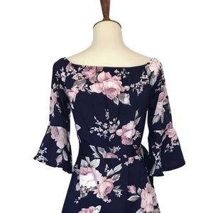 This sexy off the shoulder mini is navy with a pink floral print. It has three quarter butterfly ruffle sleeves, and a tie at the waist. This can be worn over the shoulder as well.