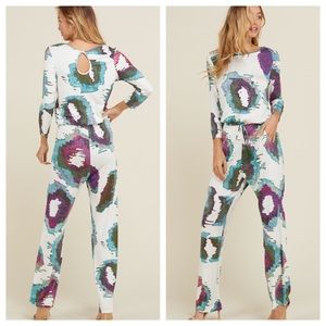 Multicolor print knit jumpsuit with round neck, 3/4 Sleeves, Elastic Low Waist with Tie, Side Pockets, Straight Leg, Full Length, Back Keyhole, and Relaxed Fit