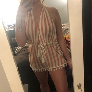 Striped Backless Salmon and White Romper