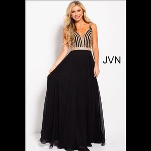 This perfect, affordable prom dress is JVN by Jovani. Make this your winning choice with its sleeveless, plunging sweetheart v-neck, sheer mesh panel and open lower back. The full-length skirt contrasts in sheer and solid layering. This dress will please you as well as the crowd at your formal event.