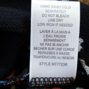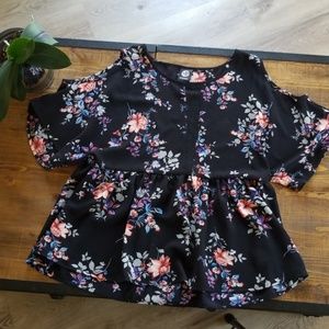 Beautiful flowy black top with floral design by Babeau. Cold shoulder short sleeve sheer black fabric down the center is discreetly sexy.