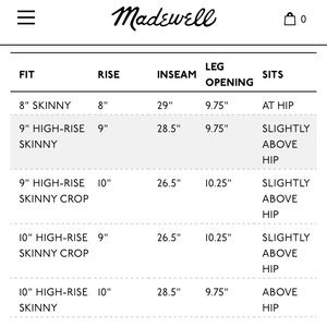 Front rise: 9"; inseam: 28 1/2"; leg opening 9 3/4"