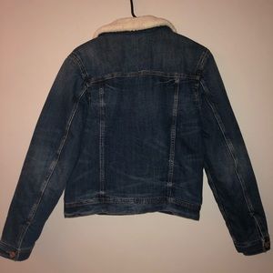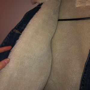 Sheepskin lined and collared vintage denim jacket from American Eagle, medium wash, lightly used, size medium but tight fit because of the lining