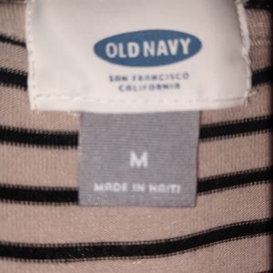 2 shirt bundle of Old Navy size medium long sleeved T-shirts. One shirt is tan with black stripes and the other is black with white stripes. These shirts are very versatile and can be used to dress up by adding dress pants or a skirt and necklace or can be worn dressed down with jeans and sneakers or sandels.