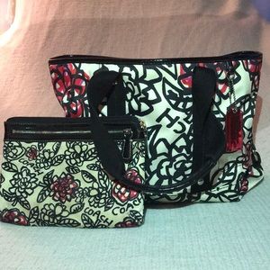 Original Coach Poppy tote with matching clutch. In very good condition, looks almost new! Black, white, and fuchsia. The tote has several pockets on the inside and opens wide to hold a lot. The clutch has a zip pocket on the outside and is big enough for a night to go out! Selling both the tote and the clutch together.