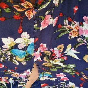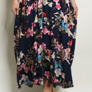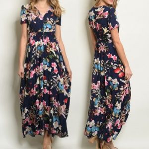 Beautiful navy blue with floral pattern maxi dress! Dress features a v-neck, maxi length, front slit, stretch waist, button front, short sleeves, and fabulous flowers with butterflies pattern! Comfy and easy to wear! Perfect for spring, summer and fall! Great for weddings or weekend getaways!