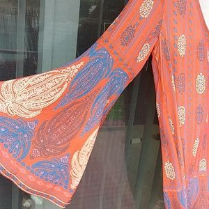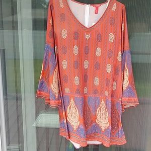 NWT. Dress/Long Top is multi colored with flared sleeves. Blues orange and cream. Zip up 1/2 back. 19" from pit to pit and 34" in length from top of back collar to bottom hem.