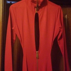 Red dress short in front and long in back. Has opened cleavage and split in front . The back is out and does stretch. Can be worn alone, with shorts or leggings! Great for vacation/cruise, date night or concert! Has gold zippers