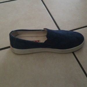 Medium wash blue denim Prada Sport slip-on sneakers with round toes, elasticized gores at sides and rubber soles they are used see pictures but in great shape not sure if men or womens ... unisex sneakers a bit dirty from white trim see pictures